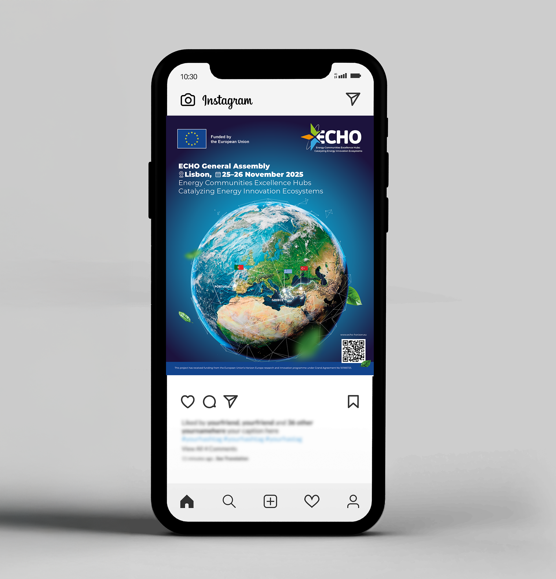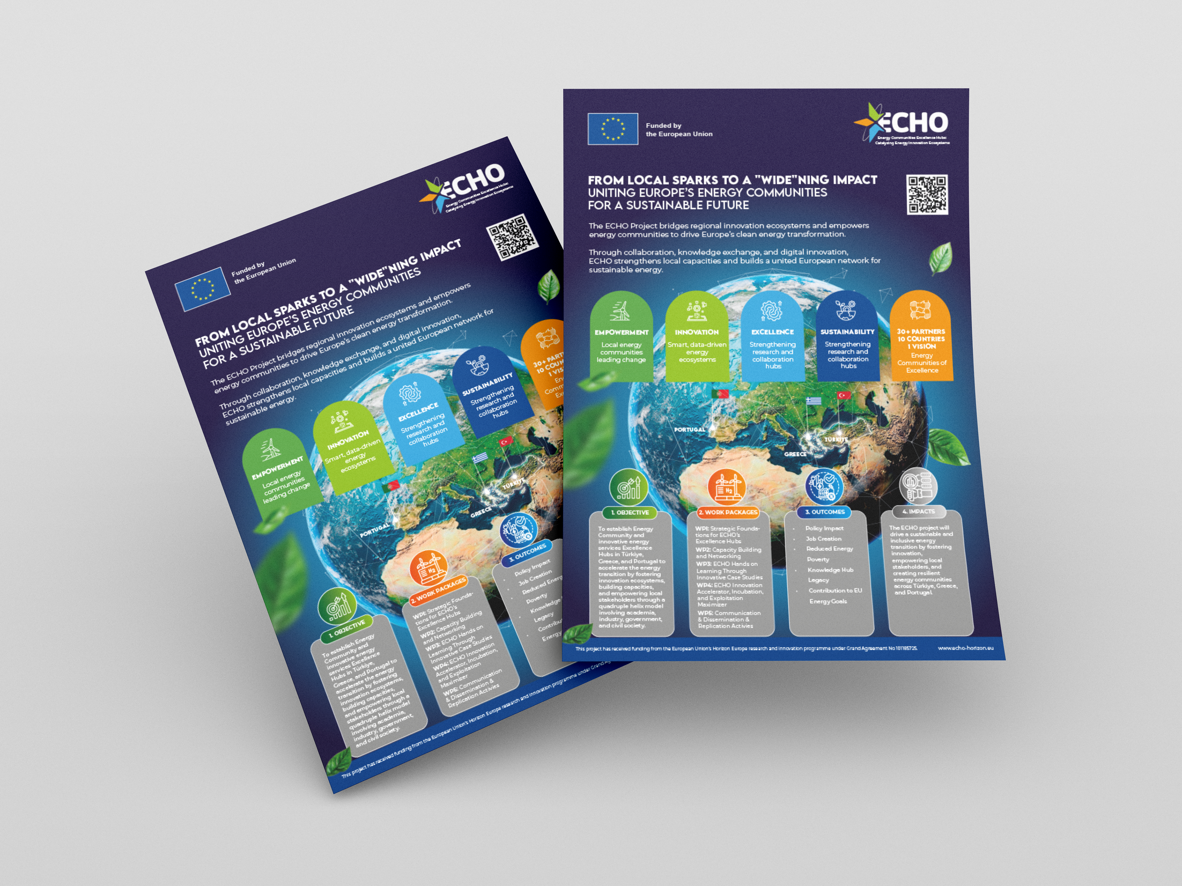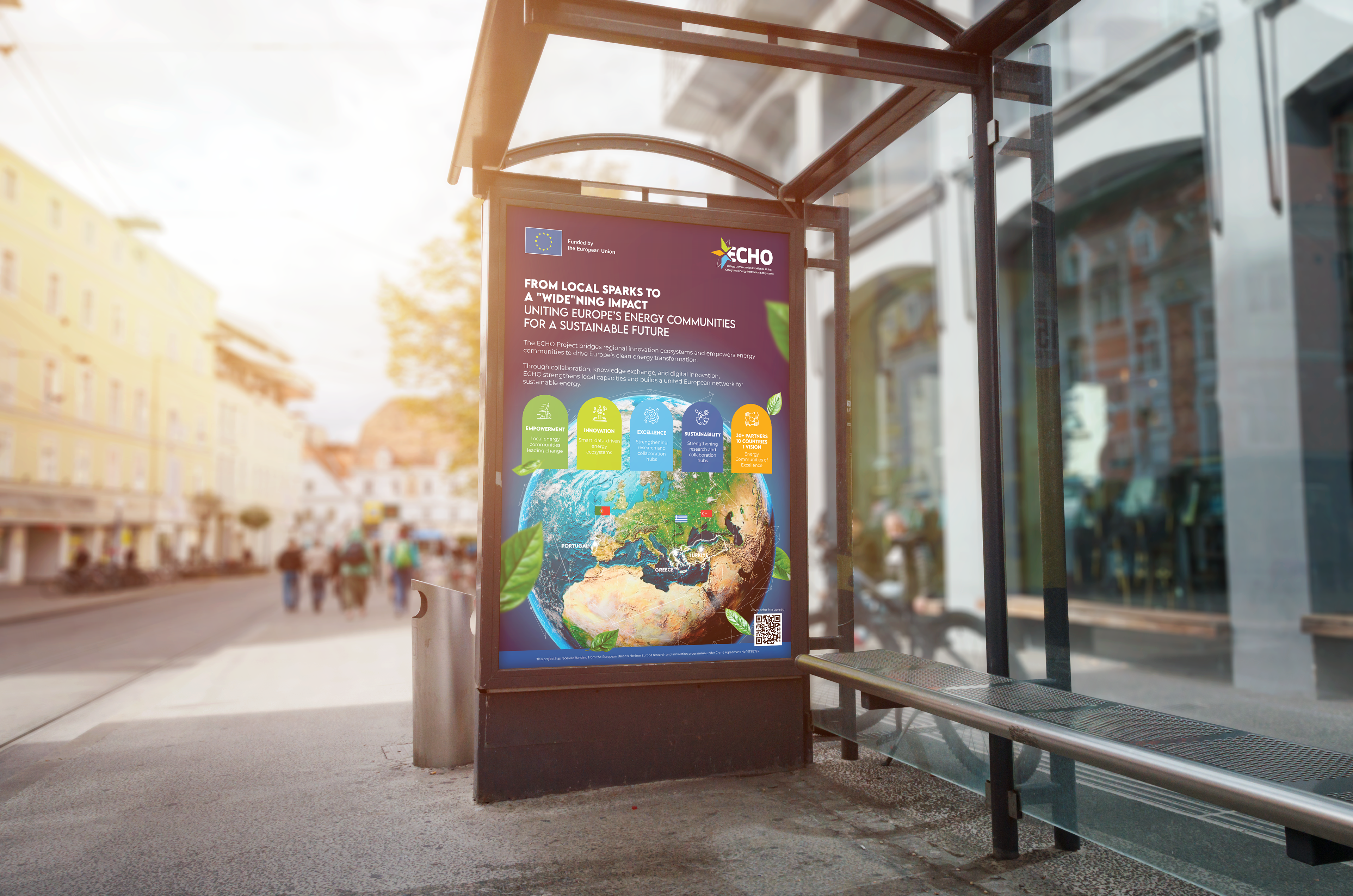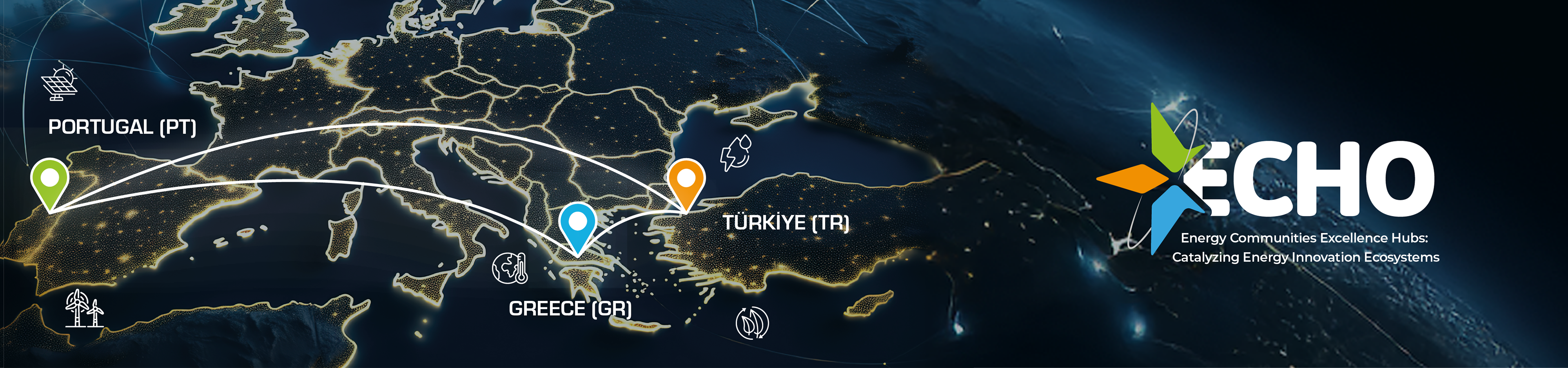 The ECHO project is a project carried out by the European Union that aims to establish Centers of Excellence for Energy Communities and innovative energy services in Türkiye, Greece, and Portugal. These centers will accelerate the energy transition by fostering innovation ecosystems, building capacity, and empowering local stakeholders. Using the quadruple helix model, the ECHO consortium brings together academia, industry, government, and civil society within a collaborative framework. We prepare the corporate identity, advertising, and promotional activities of this project within a creative field.